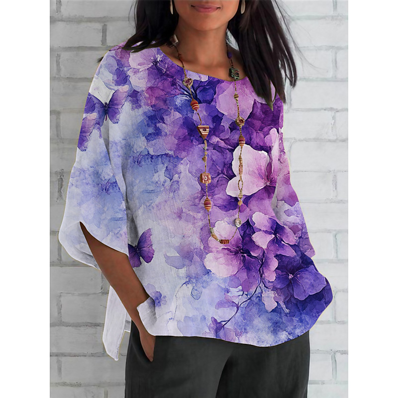 Women's Shirt Floral Daily Casual 3/4 Length Sleeve Crew Neck Regular Tops Daily Holiday Print Purple Summer Spring Fall