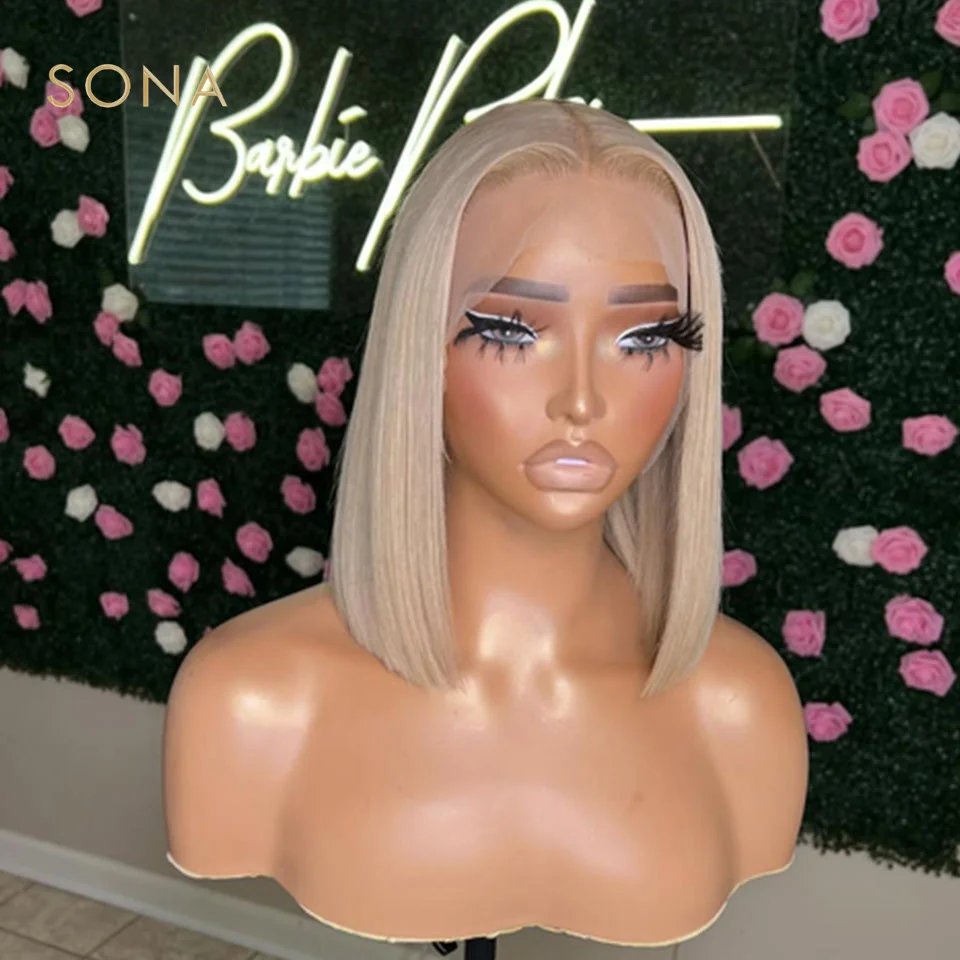Brazilian 100% Virgin Remy Human Hair Short Bob 13x4 Lace Front Human Hair Wig With Bangs Ombre Straight Ash Blonde Glueless 5x5 Lace Closure Wig For Women