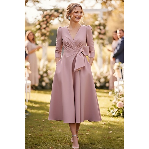 Linea ad A Lunghezza Tè Vestito da Festa Abito da Cocktail Abito da invitata a nozze Abito da cerimonia per signora Manica 3/4 Scollo a V Elegante Vintage Formale Raso con Fiocco/Fiocchi Arricciato