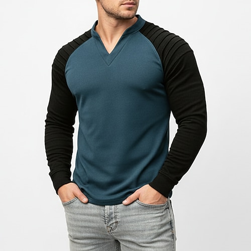 T-shirt da uomo in finta pelle scamosciata, manica lunga, scollo a V, design antirughe, plissettata, autunno inverno, color block, vintage, quotidiano, retrò, arricciato, color block, per esterni,