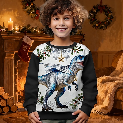 Weihnachten Jungen 3D Dinosaurier Sweatshirt Langarm Frühling Herbst Mode Basic Kinder 4-12 Jahre Rundhalsausschnitt Outdoor Lässig Täglich Normale Passform