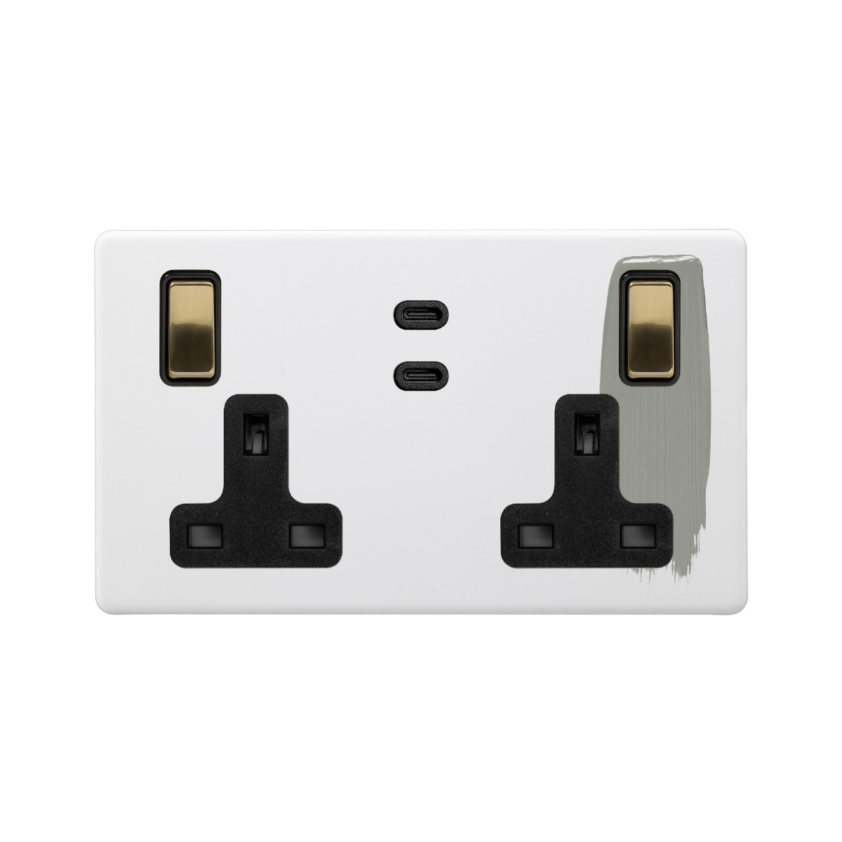 Soho Lighting Primed Paintable 2 Gang 65W USB C+C Socket (13A Socket + 2 USB C Ports) with Brushed Brass Switch with Black Insert - Size: 86mm x 146
