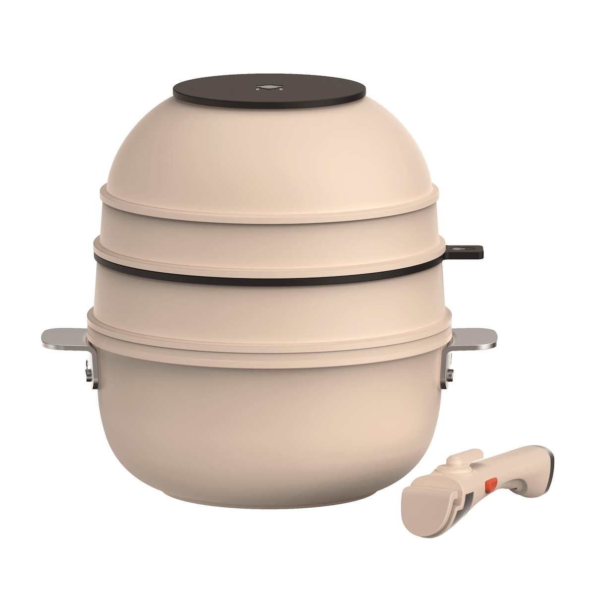 Masterpro Share & Play - 10-teiliges stapelbares Kochgeschirrset aus Aluminiumguss mit abnehmbarem Griff und beiger Keramikbeschichtung