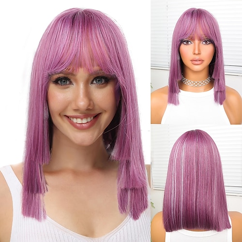 Synthetische Perücken Glatt Natürlich glatt Mittelscheitel Gerader Pony Perücke 12 Zoll Pink-violett Synthetische Haare 12 Zoll Damen Weich Lila