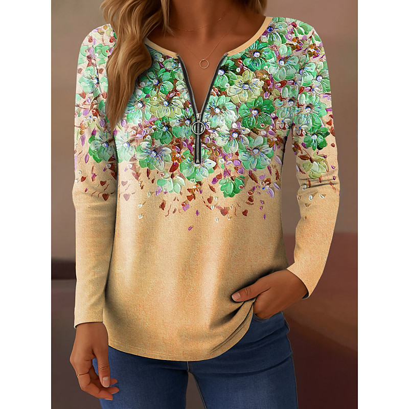 Women's T shirt Long Sleeve Quarter Zip Long Sleeve Casual Floral Graphic Gradient Elegant Vintage Stylish V Neck Regular Tops Daily Yellow Pink Blue Purple Green Spring Fall Prefall