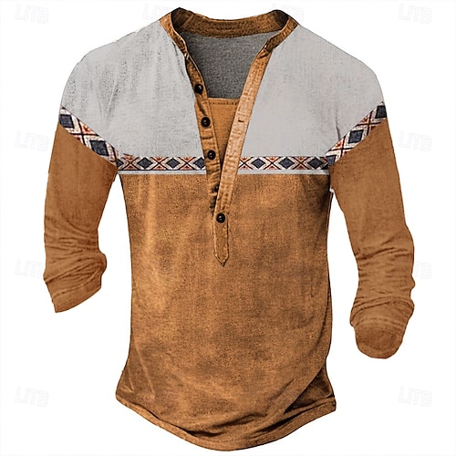 Herren Geometrisch Druck T Shirt Henley Hemd Langarm Designer Retro Vintage Ethnisch Straße Lässig Täglich Sommer Frühling Herbst Schwarz Grün Marineblau Braun Hellgrau Henley Henley T-Shirt