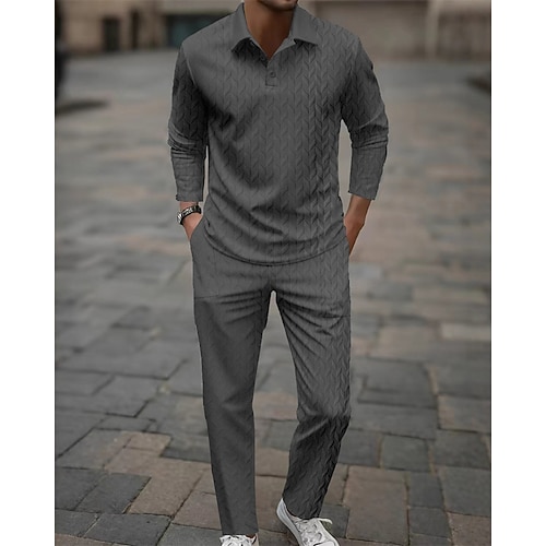 Herren T-Shirt Anzüge Hemd- und Hosensets 2-teiliges Outfit Langarm Revers Frühling Herbst Einfach Mode Lässig Jacquard 2 teilig Urlaub Alltagskleidung Ausgehen Schwarz Weiß Marineblau Top T-Shirt