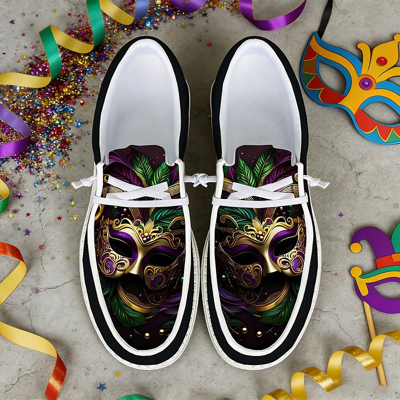 Men's Mardi Gras Themed Slip-On Boat Shoes - Vibrant Purple Green Masquerade Print Casual Shoes, Lightweight Comfort for Carnival Parades, Festival Outings, Casual Gatherings Themed Parties