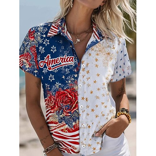 Amerikanischer Unabhängigkeitstag Damenhemd Kurzarm Grafik Flagge Vintage Modisches Leger Hemd Kragen Reguläre Tops Alltagsweiß Sommer Frühling