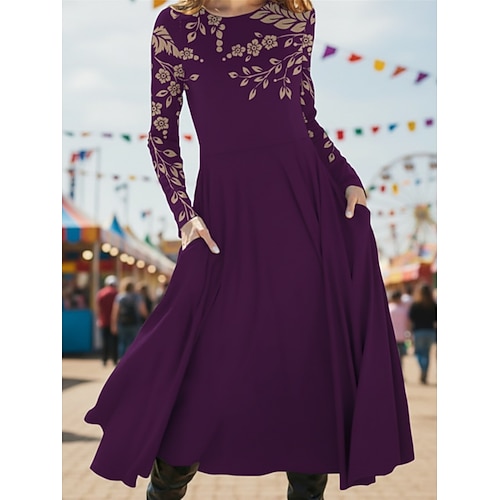 Per donna Abito Midi Vestito Casual Vestito a ruota Elegante Moda Quotidiano All'aperto Weekend Vestibilità regolare Grafico Manica Lunga Girocollo Viola chiaro Viola Fucsia Verde Primavera Autunno