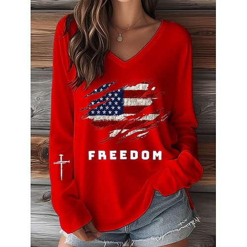 Giorno dell'Indipendenza Americana Per donna Maglietta Grafico Lettera Vintage Elegante Classico Manica Lunga Scollo a V Top Regolari Quotidiano Stampato Blu Nero Bianco Rosso Estate Primavera