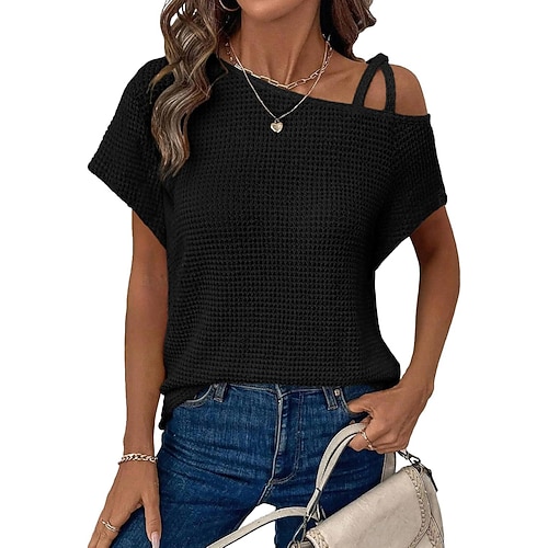 Per donna Maglietta Tinta unica Vintage Elegante Casual Manica Corta Collo asimmetrico Top Regolari Quotidiano Uscire Weekend Patchwork Nero Bianco Marrone chiaro Verde Estate Primavera Autunno