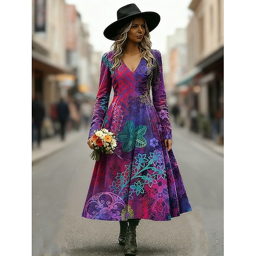 Damen Midikleid A Linie Kleid Urlaub Lässig Täglich Normale Passform Blumen Grafik Langarm V Ausschnitt Gelb Rote Purpur Herbst Winter