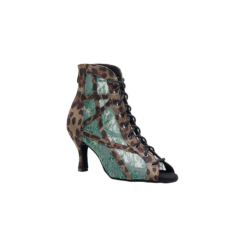 Women's Green Leopard Lace-Up Latin Dance Boots with Open Toe, Stylish High Heel Shoes for Professional Latin Ballroom Dance
