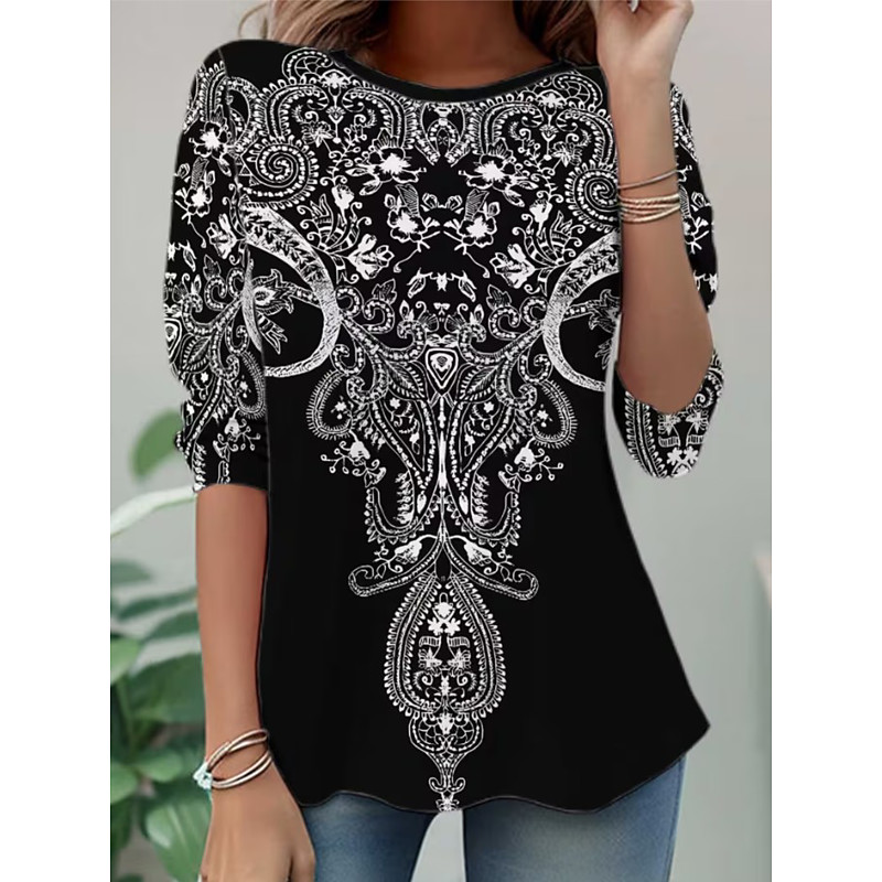 Women's T Shirt Graphic Paisley Vintage Stylish Casual Long Sleeve Crew Neck Regular Tops Daily Weekend Print Black White Fall Winter
