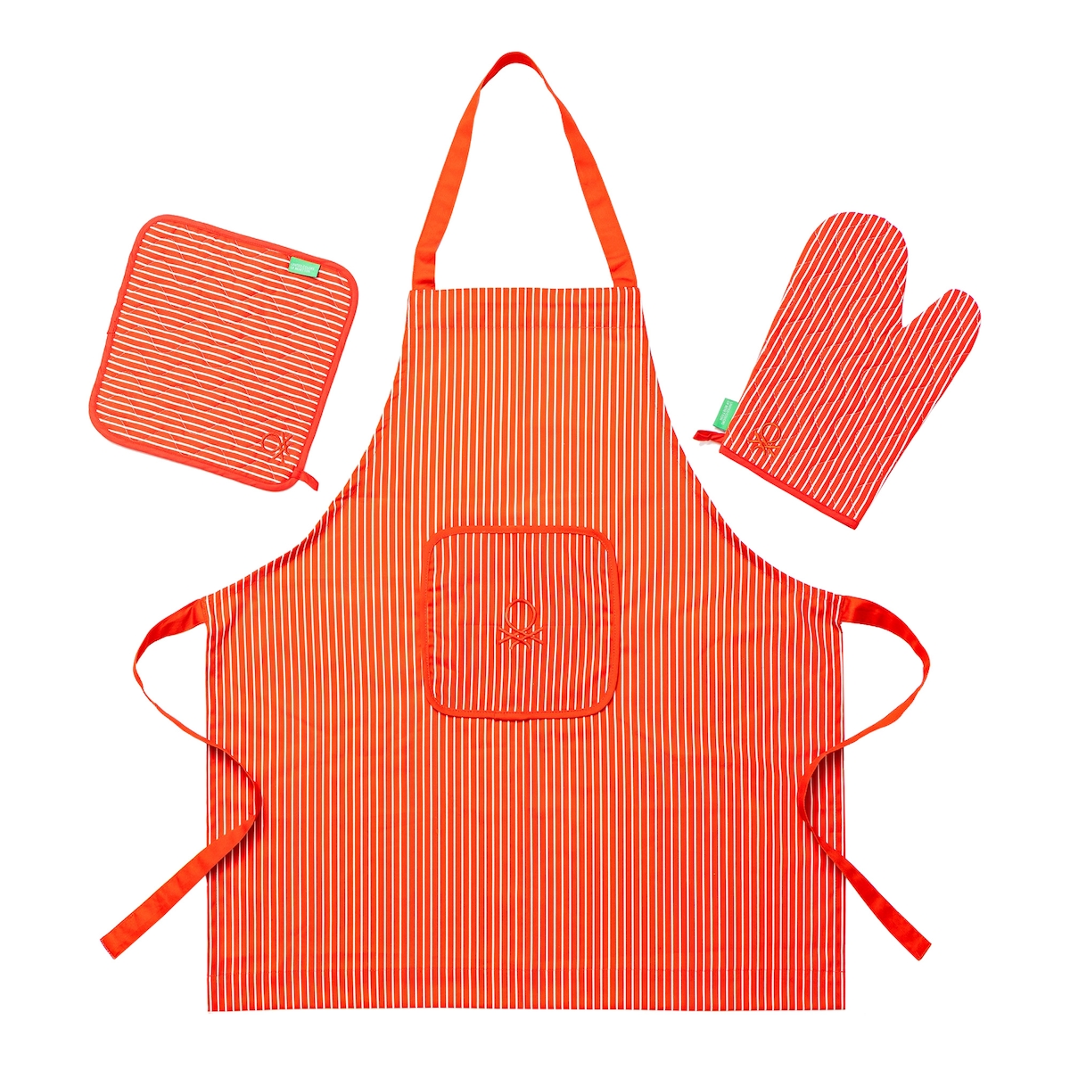 Benetton - 3-teiliges Schürzen-Set (Schürze + Fäustling + Topflappen), 100 % Baumwolle, 190 g/m², Red Rainbow Be