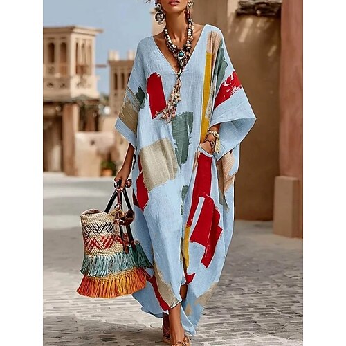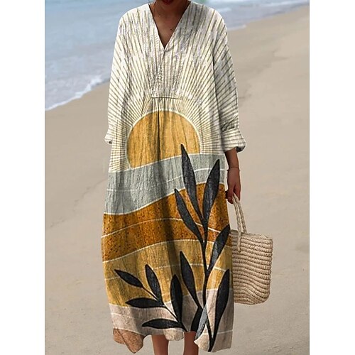 Per donna Abito maxi Abito a Tubino Vestito Estivo Vacanza Casual Spiaggia Uscire Vestibilità comoda Grafico Geometrico Astratto Manica Lunga Scollo a V Blu Giallo Chiaro Bianco sporco Beige Estate