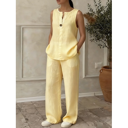 Per donna Set di Pantaloni Finto cotone e lino Senza Maniche Manica Corta Scollo a V Tinta unica Moda Streetwear Casuale Quotidiano All'aperto Blu Bianco Giallo Primavera Estate Vestibilità comoda