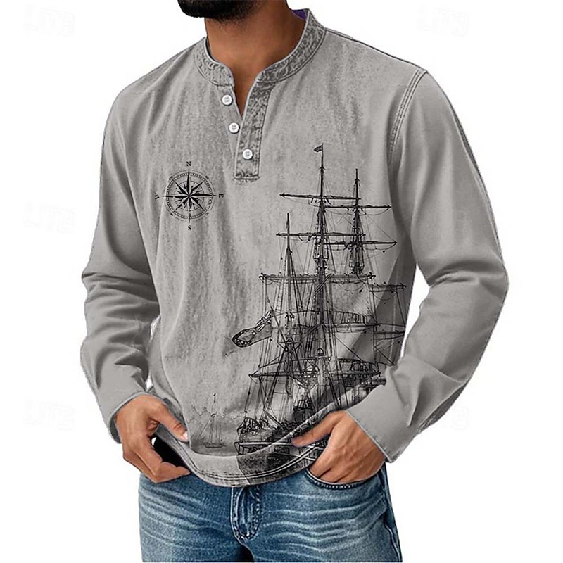 Men's Nautical Sailboat Henley Shirt T shirt Tee Long Sleeve Daily Retro Vintage Casual Casual Holiday Going out Spring Spring Fall All Seasons Gray Light Blue Purple Khaki Henley Henley T-Shirt