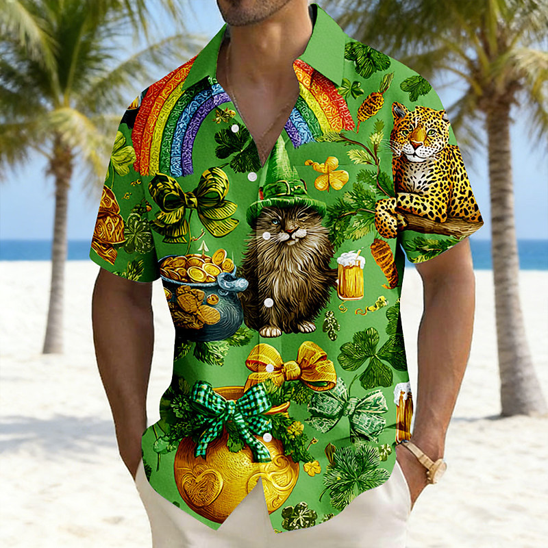 St. Patrick's Day Men's Shamrock A pot of gold Animals Shirt Summer Shirt Button Up Shirt Short Sleeve Vintage Retro Holiday Summer Turndown 3D Print Front One Pocket Linen Like Shirt Green