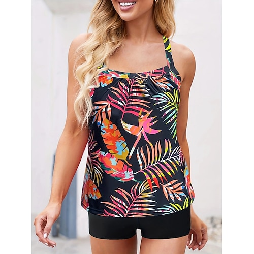 Costume da bagno tankini da donna 2 pezzi pantaloni corti palma controllo pancia vita alta slinguato senza schiena vacanza in spiaggia scollatura a giro floreale senza maniche