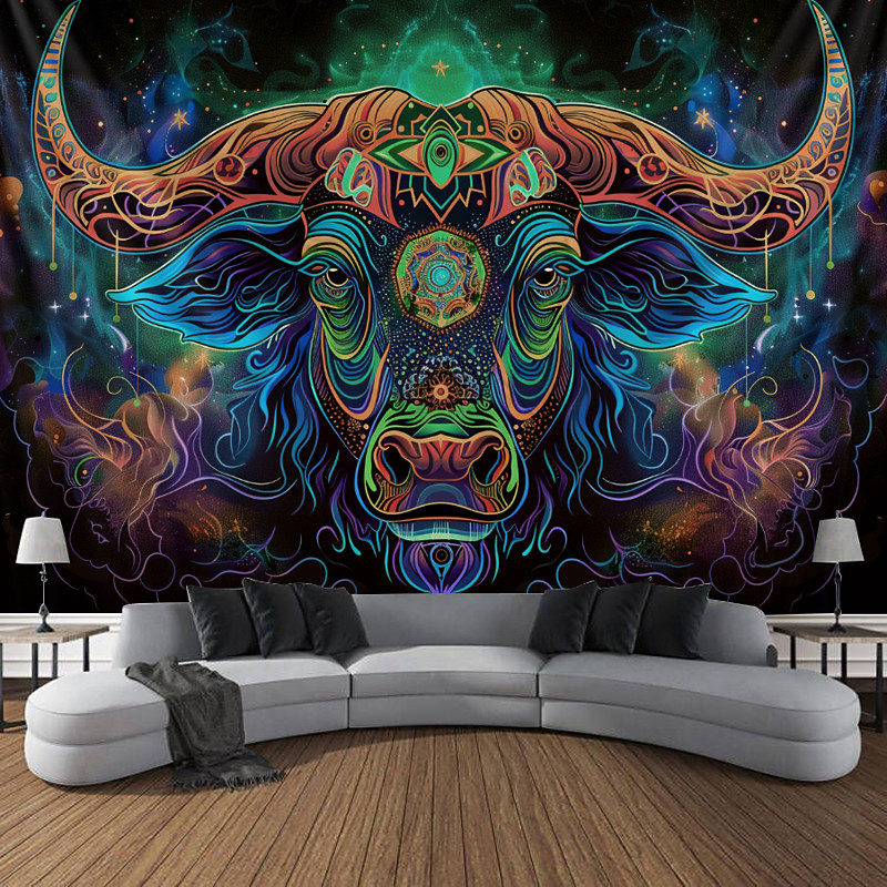 Blacklight Tapestry UV Reactive Glow in the Dark Glow Party Neon Bull Animal Psychedelic Trippy Misty Hanging Tapestry Wall Art Mural for Living Room Bedroom