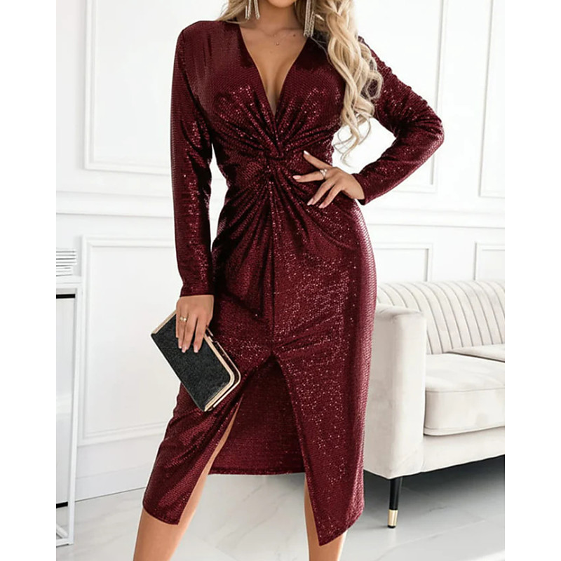 Women's Midi Dress Sequin Dress Prom Dress Party Dress Cocktail Dress Elegant Modern Evening Party Party Special Occasion Regular Fit Plain Long Sleeve V Neck Black Wine Apricot Grey Spring Fall