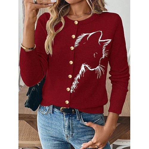 Per donna Cardigan Elegante Vintage Quotidiano Grafico Animale A Coste Girocollo Bottoni Lavorato a maglia Manica Lunga Top Regolari Maglia All'aperto Lavoro Quotidiano Nero Rosso Autunno Inverno