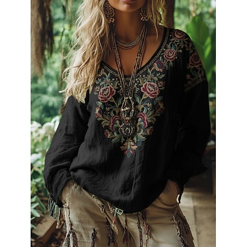 Per donna Maglietta bohémien Maglietta Floreale Vintage Etnico Casual Manica Lunga Scollo a V Top Regolari Quotidiano Weekend Abbigliamento da vacanza Stampato Nero Rosa Primavera Autunno