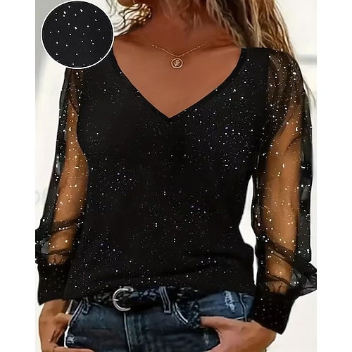 Per donna Blusa Top Eleganti Top con paillettes Tinta unica Semplice Elegante Vintage Carino Manica Lunga Girocollo Top Regolari Quotidiano Lavoro Ferie Arricciato Paillettes Patchwork Argento Nero