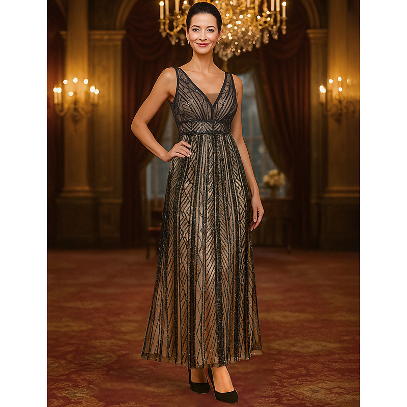 A-Line Ankle Length Party Dress Cocktail Dress Wedding Guest Dress Mother of the Bride Dress Sleeveless V Neck Elegant Vintage Sparkle Shine Formal Evening Wedding Party Tulle with Beading