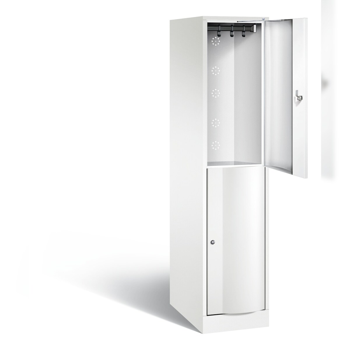 kaiserkraft Schwarz-Weiß-Spind Evolo PLUS Sitzbank, schmal, 2 Abteile, verkürzte Trennwand mittig, weiß, B 800 mm, Zylinderschloss, mit untergebauter Sitzbank,