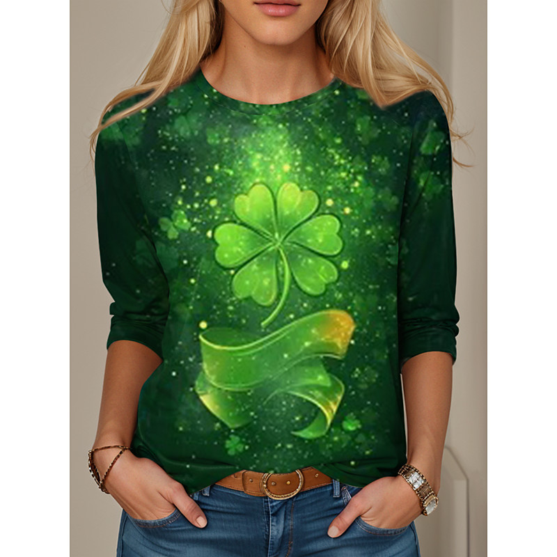 St. Patrick's Day Women's T Shirt Shamrock Stylish Casual Long Sleeve Crew Neck Regular Tops Daily Print Dark Green Green Spring Fall