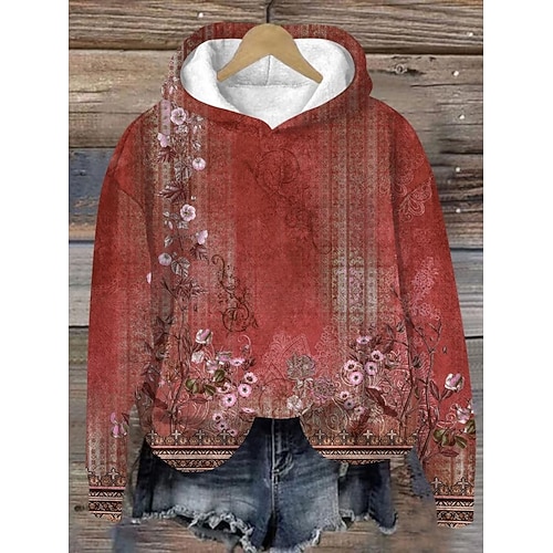 Per donna Felpa con cappuccio Floreale Streetwear Casual Manica Lunga Con Cappuccio Top Regolari Streetwear Ferie Tasca Stampato Vino Verde Autunno Inverno