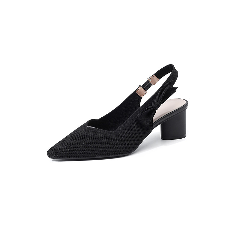 Women's Beige Pointed Toe Knit Slingback Pumps with Bow – Comfortable Mid Block Heel Breathable Shoes for Daily Commuting, Office Work Professional Ladies