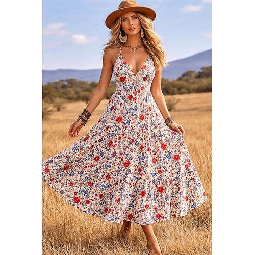 Per donna Abito maxi Abito Boho Vestito Estivo Vestito Casual Abito Etnico Elegante Bohemien Vacanza Spiaggia Ferie Data Vestibilità comoda Floreale Grafico Senza Maniche Scollo a V Nero Rosso
