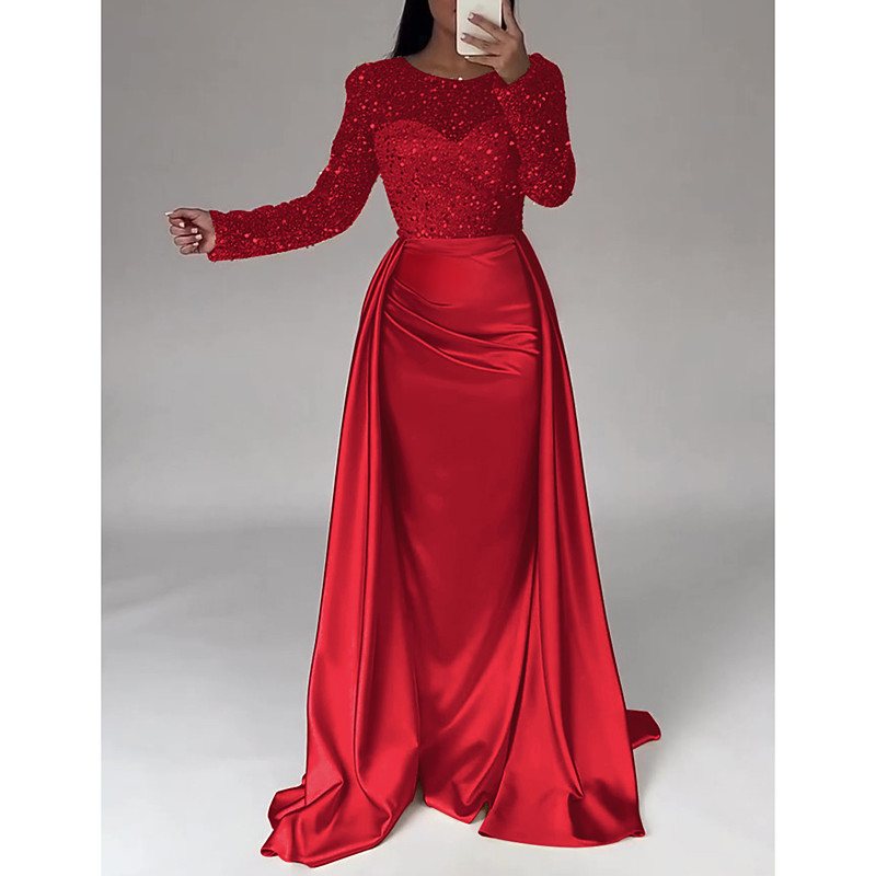Mermaid Trumpet Floor Length Evening Gown Elegant Sparkle Shine Long Sleeve Illusion Neck Carnival Masquerade Champagne Mother Of the Bride Dress Satin Sequined with Pearls Overskirt