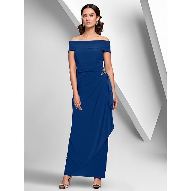 Sheath Column Floor Length Wedding Guest Dress Chiffon Dress Formal Dresses Mother of the Bride Dress Cap Sleeve Off Shoulder Elegant Minimalist Wedding Guest Chiffon with Crystal Brooch