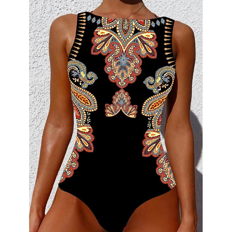 Women's One Piece Swimsuit Slimming Boho Monokini Backless Tummy Control High Waist Slim Vacation Beach Wear Geometric Round Neck Sleeveless Bathing Suits