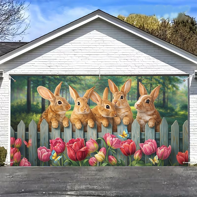 Easter Bunny Garage Cover, Adorable Bunnies Peeking Over Picket Fence, Easter-Themed Wall Decor for Festive Spring Home Styling, Perfect for Holiday Decorations