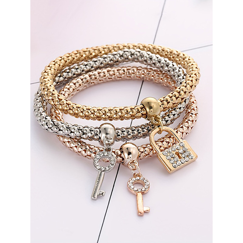 Women's Bohemian Alloy Bracelet Set, 3-Piece with Key and Lock Charms, Multi-Colored, Perfect for Casual and Festival Wear