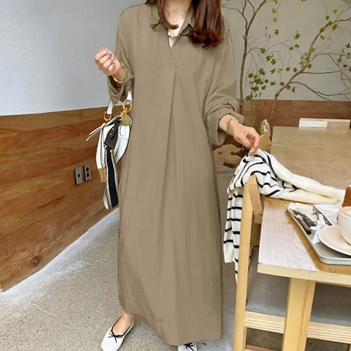 Per donna Abito lungo Abito lungo Abito chemisier Abito in cotone e lino Abito estivo Moda Informale Da mare Giornaliero Appuntamento Standard Liscio Manica lunga Bavero Nero Vino Cachi Verde militare
