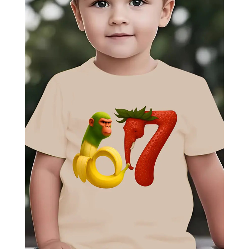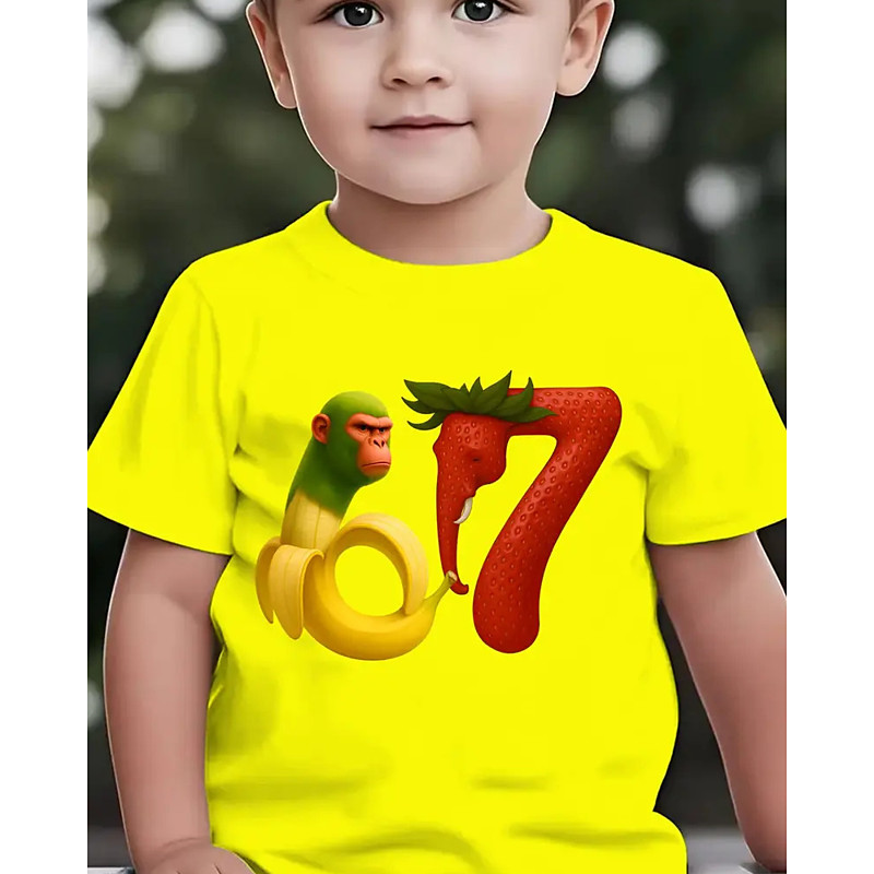 Boys' Summer Casual Short Sleeve T-Shirt with Banana, Gorilla, Strawberry, Elephant Number 67 Cartoon Print - Vibrant Yellow with Red Green Design, Comfortable Fit Tee, Playful Graphic Tee,