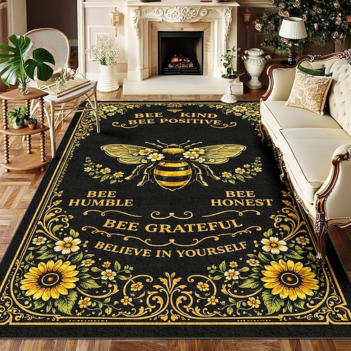 Tappeto in finta cashmere, con motivo floreale di girasoli e ape, lavabile, antiscivolo, a pelo corto, ideale per soggiorno, camera da letto, ingresso e arredamento in stile rustico.
