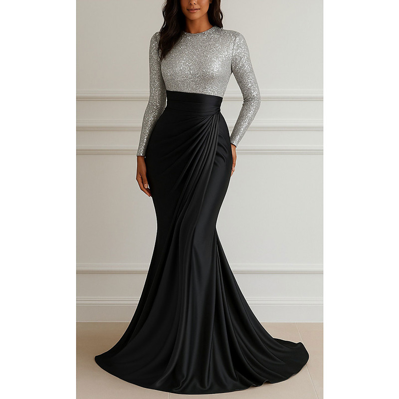 Mermaid Trumpet Floor Length Evening Gown Elegant Silky Long Sleeve Crew Neck Wedding Formal Champagne Mother Of the Bride Dress Stretch Satin with Glitter Pleats