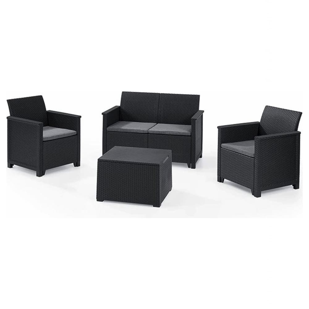 Salotto set rattan divano + 2 poltrone + tavolino contenitore nero