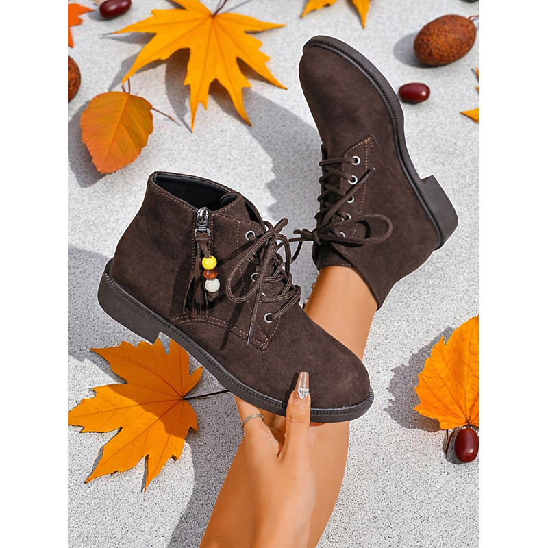 Women's Dark Brown Lace-Up Ankle Boots with Side Zipper and Beaded Tassel Detail, Comfortable Low Heel City Nomadic Style Faux Suede Boots for Casual Daily Outfits Wear