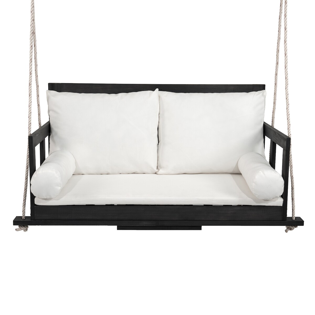 Merax Hängeschaukel 2-Sitzer aus Akazienholz, Schaukelbank Outdoor mit Kissen & Seilen, ohne Gestell (nur Sitz mit Seilen), Schwarz + Beige