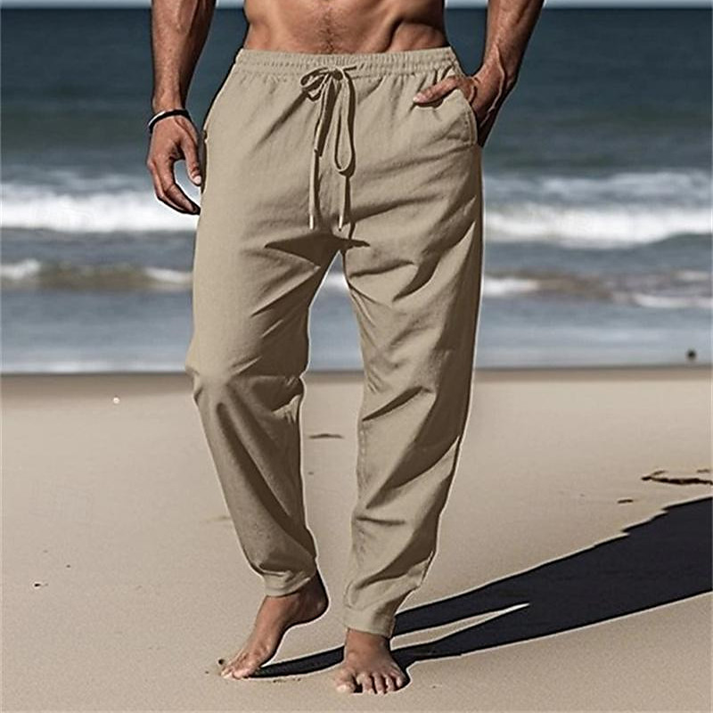 Men's Linen Pants Trousers Beach Pants Pocket Elastic Waist Drawstring Plain Comfort Breathable Vacation Daily Holiday Hawaiian Boho Black White