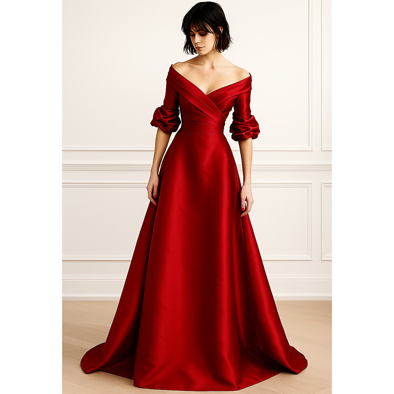 A-Line Floor Length Evening Gown Ball Gown Formal Dress Elegant 3/4 Length Sleeve Off Shoulder Wedding Formal Pocket Satin with Ruched